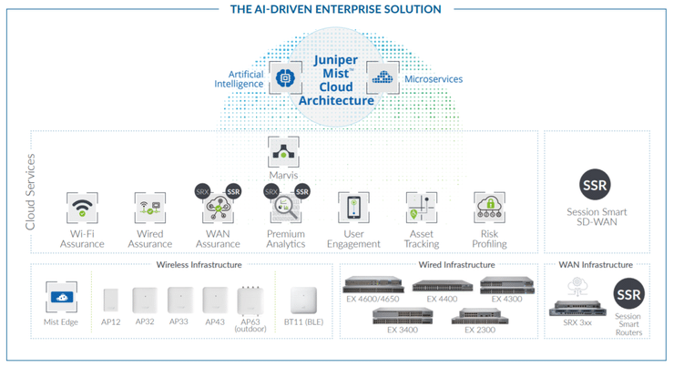 Mist AI henter data fra trådløse aksesspunkter, EX switcher og SRX brannmurer for å få en helhetlig innsikt og optimalisere brukeropplevelse fra klient til sky.